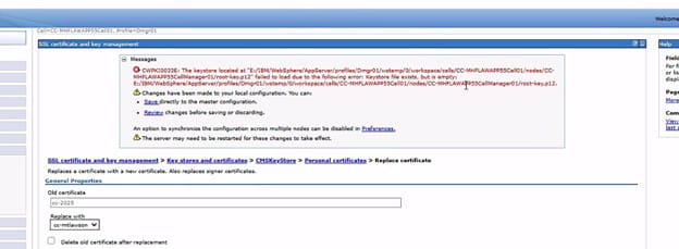 - Attempt to replace cert again, and just save to master even with error. Check the personal cert again to see if it saved configuration changes (or log back into websphere).