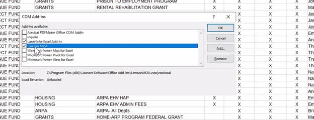 - Then in Excel Options >> Add-ins >> Manage “Com Add-ins”, enable Lawson MOA (Acrobat PDFMaker in the past has caused issues, so disable if it does, we left it enabled and it worked)