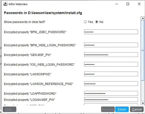 The passwords in install.cfg are encrypted in later versions of lawson. If these passwords change, it would be ideal to also change them in install.cfg so the next update doesn’t run into any issue. To do this, follow the instructions below:
