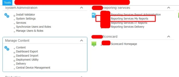 First, go into Tools when logged in as an admin and select “Reporting Services My Reports”.
