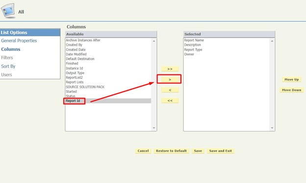 Then select “Report Id” and click the right arrow in the middle of the screen: