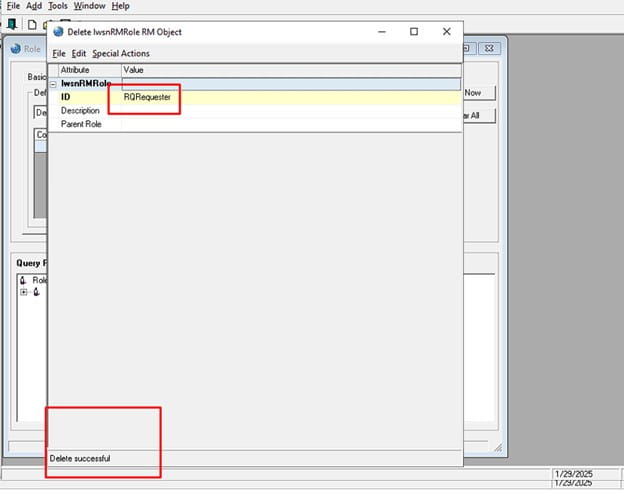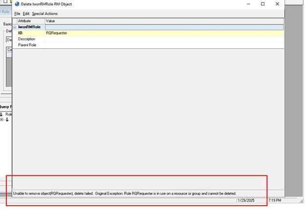 You may come across the following: Unable to remove object (RQRequester), delete failed. Original Exception: Role RQRequester is in use on a resource or group and cannot be deleted. (Note: there are 3 screenshots below)